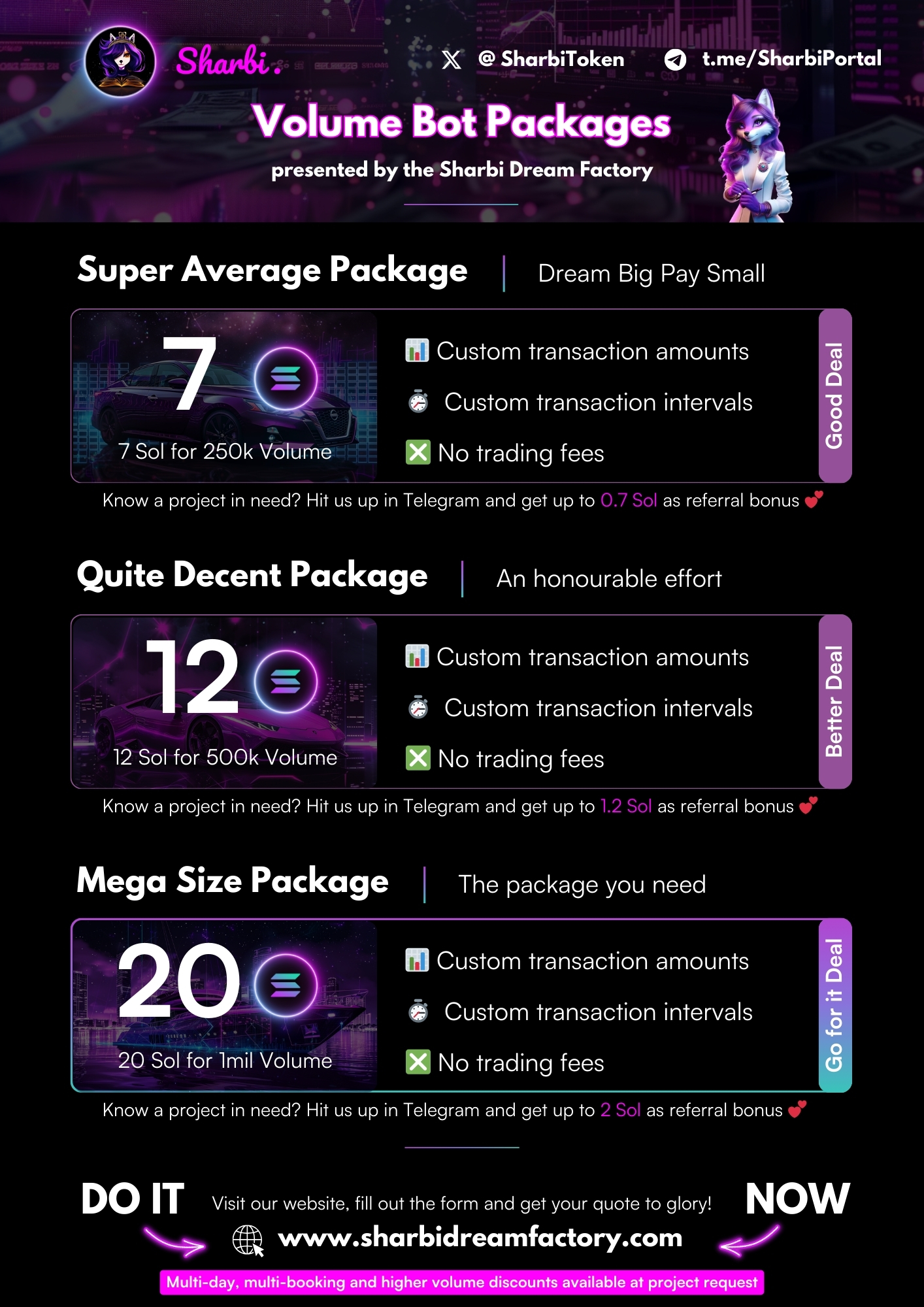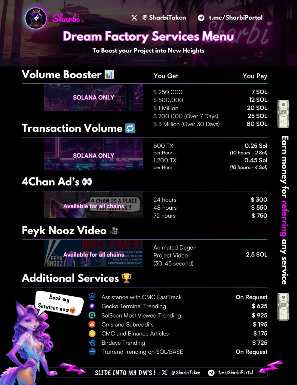 Sharbi Dream Factory is your go-to hub for crypto services, including development, utility building, legal advice, and more. Exclusive tools like volume booster bot and sniper bots are available for Solana network.
