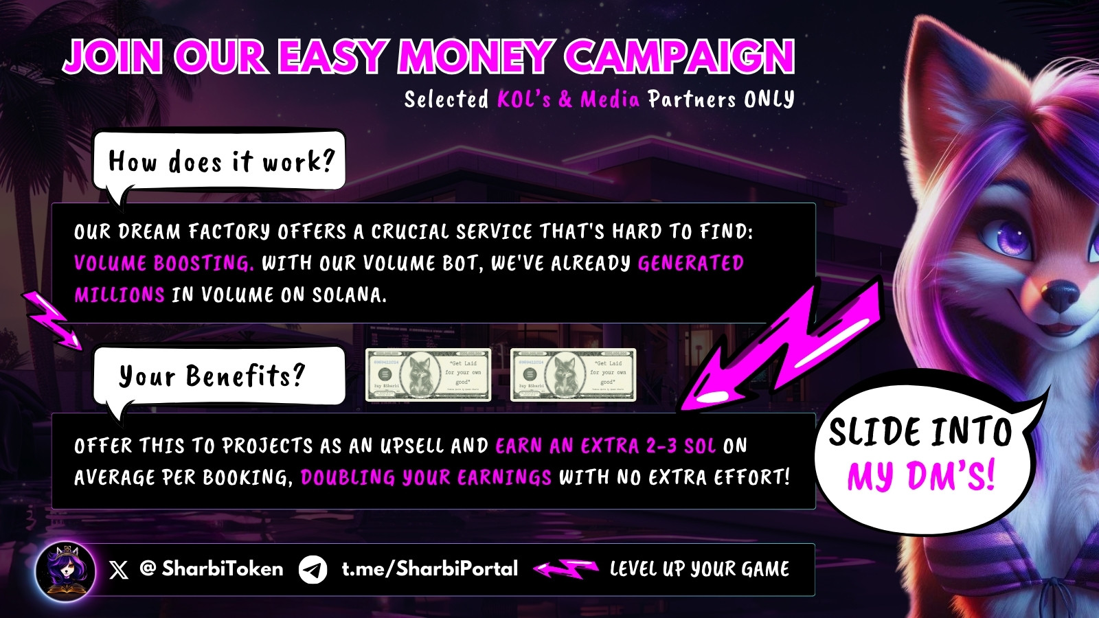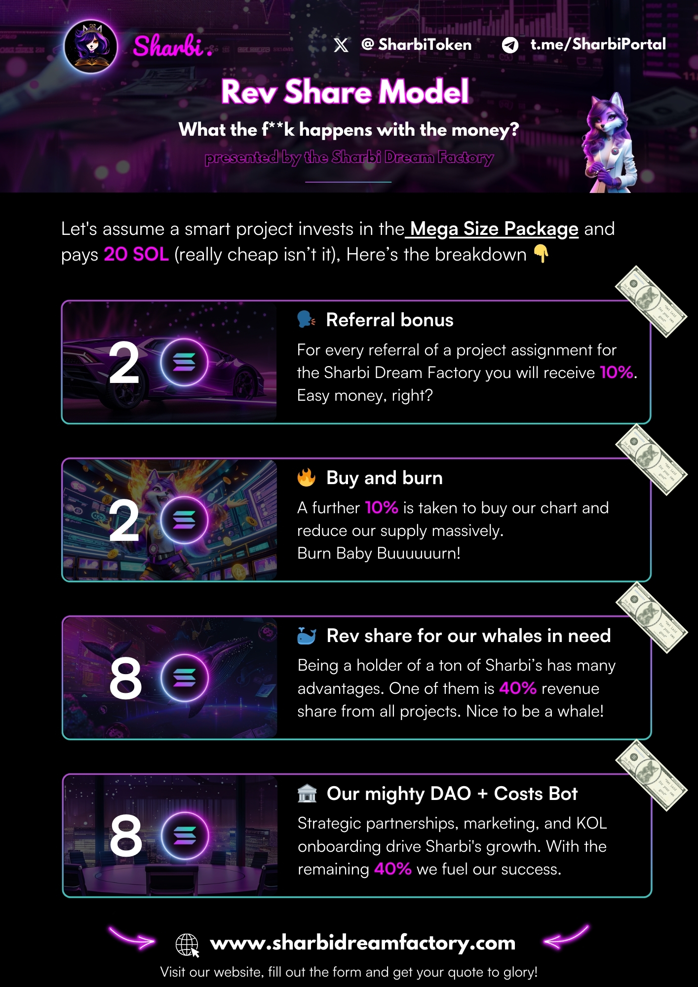 π£οΈ Referral Bonus: For every referral of a project assignment for the Sharbi Dream Factory, you will receive 10% of the deal. Easy money, right?